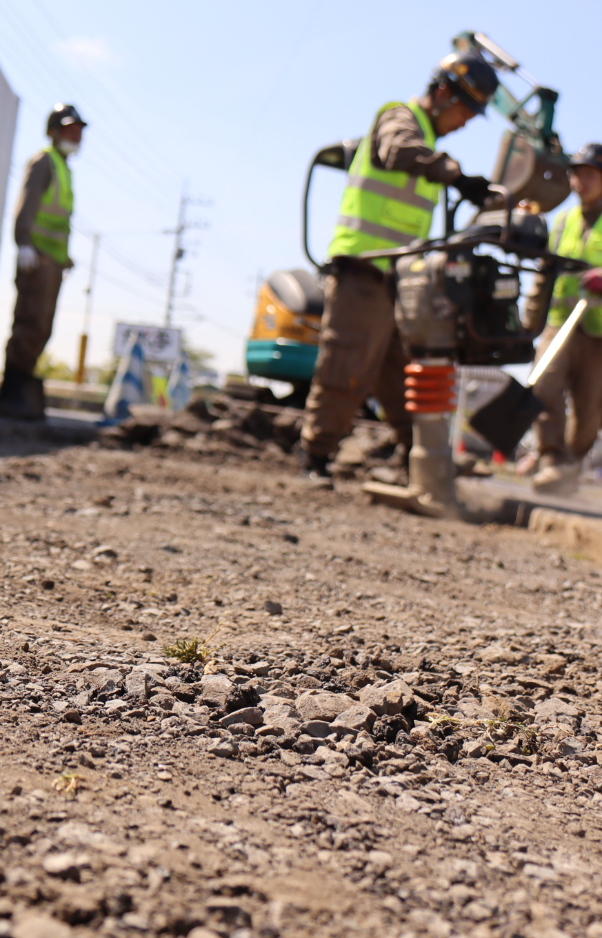 道路工事、舗装工事、下水道工事、電気関連土木工事、太陽光発電所造成工事、自営線工事など大小様々な工事に携わってきました。